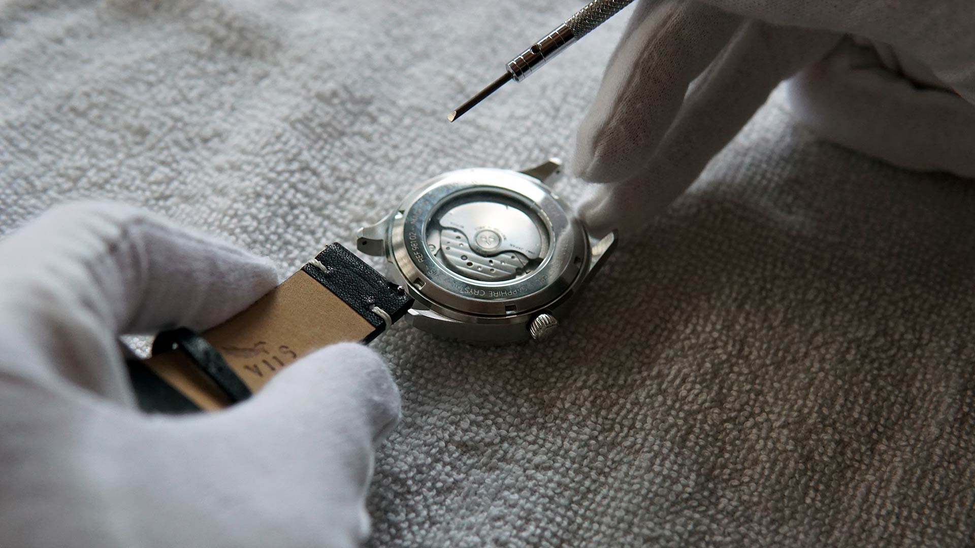 Rückseite des schwarzen Lederbands aus italienischem Kalbsleder mit Dornschließe – feine Naht, geprägtes Logo und hochwertige Verarbeitung der VIIS Flieger GMT 42 „Adriatic“.
